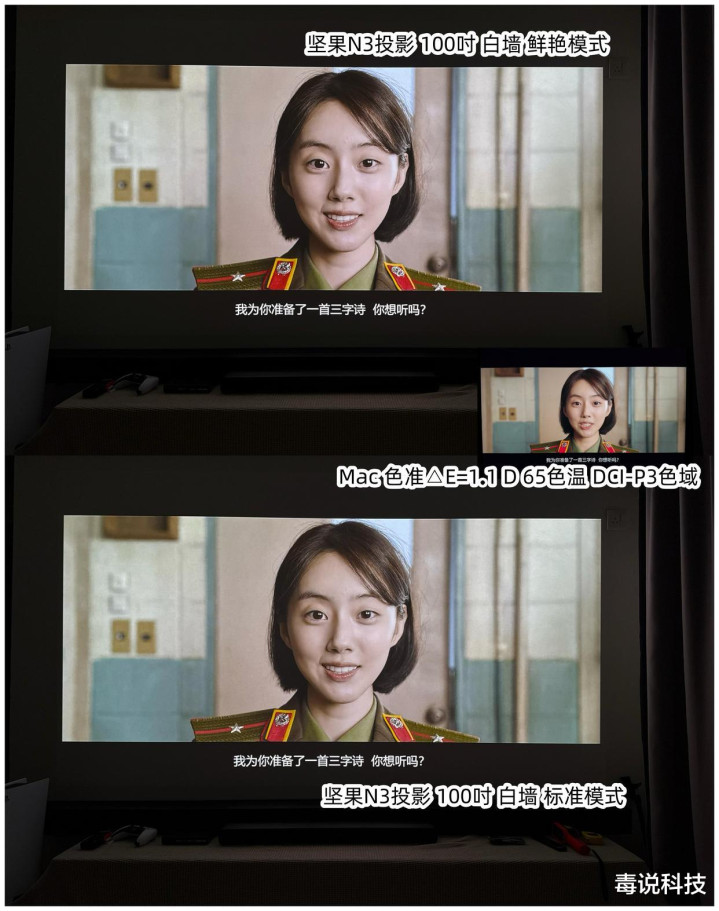 坚果N3官方宣称亮度达到1700 CVIA流明,有博主进行了实际测试,默认模式下亮度达到了1714 CVIA,标准模式下也有1599 CVIA,亮度表现未虚标,在同价位产品中具有明显优势。高亮度不仅保证了白天观看的清晰度,更在夜晚营造出影院级的观影氛围。此外,坚果N3的纯三色激光光源,让色域覆盖高达110% BT.2020,色彩表现丰富且准确,无论是观看电影、电视剧还是体育赛事,都能带来身临其境的视觉享受。
